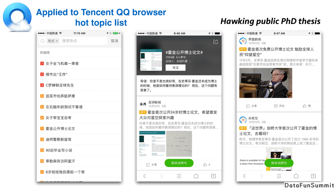 story系统被部署在早期腾讯QQ浏览器的热点话题列表中。在浏览器里,如果你去看热点新闻,每个小时它会更新热点事件列表。对于其中每一个topic,里面包含了所有不同媒体的报道。通过这个做法,用户不需要阅读多篇关于同一个topic的报道,而是可以选择一两篇进行浏览。而热点时间线不仅报道了事件的最新进展,还包含了事件的前序脉络,构成了一个完整的story。