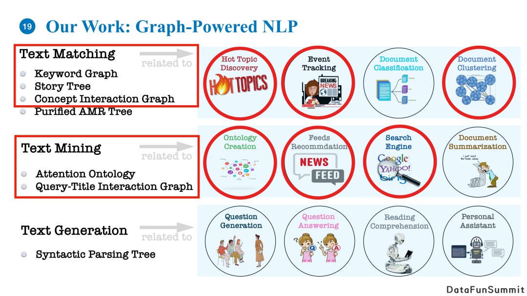 我们之前的工作覆盖了NLP领域内不同的任务,包括文本匹配、文本挖掘和文本生成,并且将它们应用到了一些列不同的应用中。我们今天分享的应用主要是基于图结构进行建模,并将其使用在文本匹配进行热点事件的挖掘和分析,细粒度文本的聚类,以及通过对用户兴趣点的建模来提高信息流的推荐搜索。