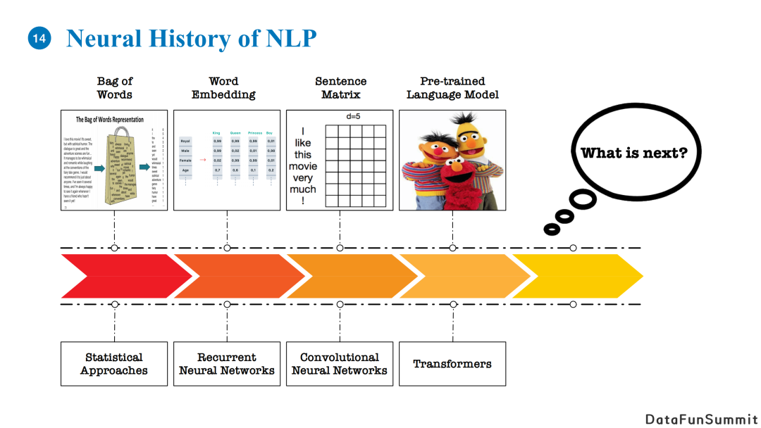 之后,自然语言处理领域提出了基于词向量的表示。如果使用one-hot encoding,假如我们存在一个两万个单词的字典,我们就是要一个两万维的向量表示它。而使用词向量的话我们可以用低维向量(200或者300维)来表达语义信息,这样我们可以使用词向量对两个词计算相似度,且相似的词其相似度会较大。常用的模型有Recurrent Neural Network(RNN)以及Long Short Term Memory(LSTM)。