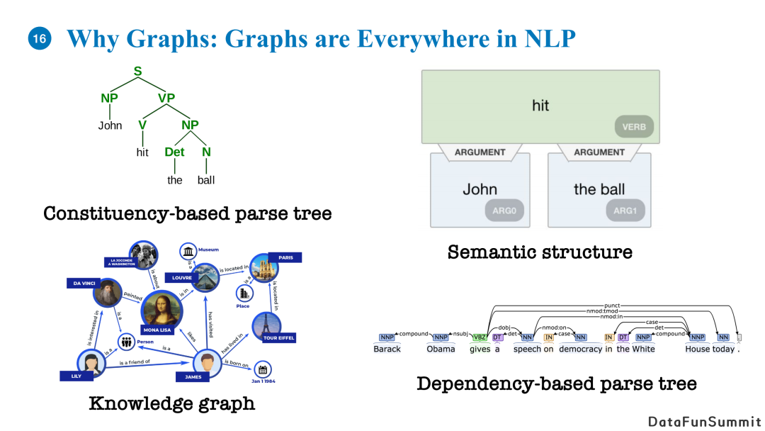 自然语言处理领域其实存在很多图结构,比如语法书、语义图、知识图谱等。从语言本身来说,自然语言是一种非常灵活的、具有可组合性的以及具有层级结构的事物,也就是说一句话的完整语义是可以被不同层级的多个细粒度语义组成的。例如一个相同语义的主动句和被动句,如果我们以一种图的方式来表达它们的话,我们会发现它们的语义层级结构其实是相同的,即使它们的顺序结构存在差异。也就是说图结构能够表达出自然语言的灵活组合性以及层级结构。