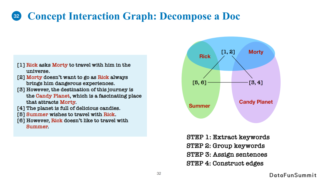 例如一篇文章有六句话。首先我们可以提取文章中所有关键词,并使用关键词构建概念交互图(Concept Interaction Graph)。具体地,我们会将关键词进行聚类(复用community detection的方法),当然分组的算法是可以自由选择的。然后,我们将一篇文章中的每一句话根据相似度分配至不同的关键词群中。最后,我们计算每一组关键词群和其他关键词群之间的相似度,根据计算结果建立带权重的边。