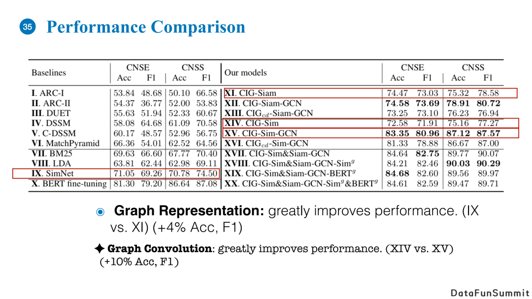 上图是我们在两个长文本数据上进行匹配的实验结果。右侧是我们的模型以及不同变种的效果,左侧是baseline。通过结果我们可以看到使用图的表示和建模的方法,匹配效果优于左侧baseline。