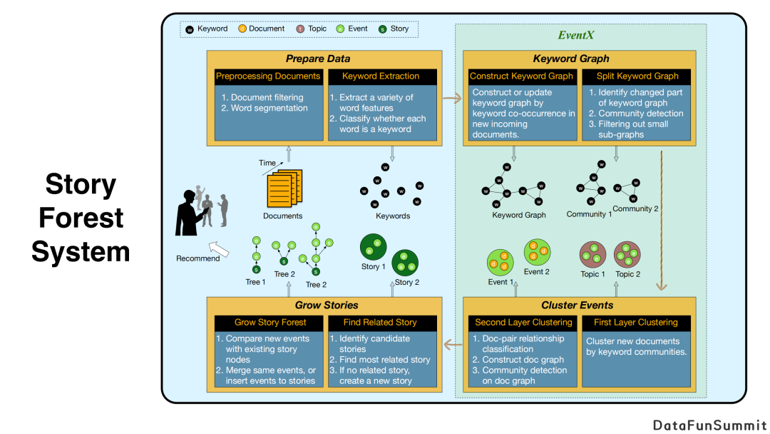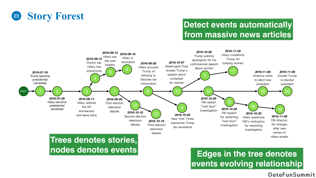 我们提出的story forest系统想利用图结构有效地组织信息,减少它们之间的冗余,并且理清它们之间的发展关系。例如上图的例子,针对2016年美国大选,我们可以把相关事件整理成一个story,每个绿色节点代表一个事件。我们认为一个事件是发生在某一个时间点,包含一群人或者一些实体的一个事情。Story中会包含一些分支,如上图希拉里的健康门,三次电视大选,希拉里的邮件门等。通过一个树形结构,我们能够纵览故事的全局发展,并且追踪其中的某一些分支。每一个节点把关于同一个事件的所有报道都聚类其中,不同事件之间具有相关性,我们可以根据时间点的发展以及事件之间的紧密程度构建如上图所示的树结构。