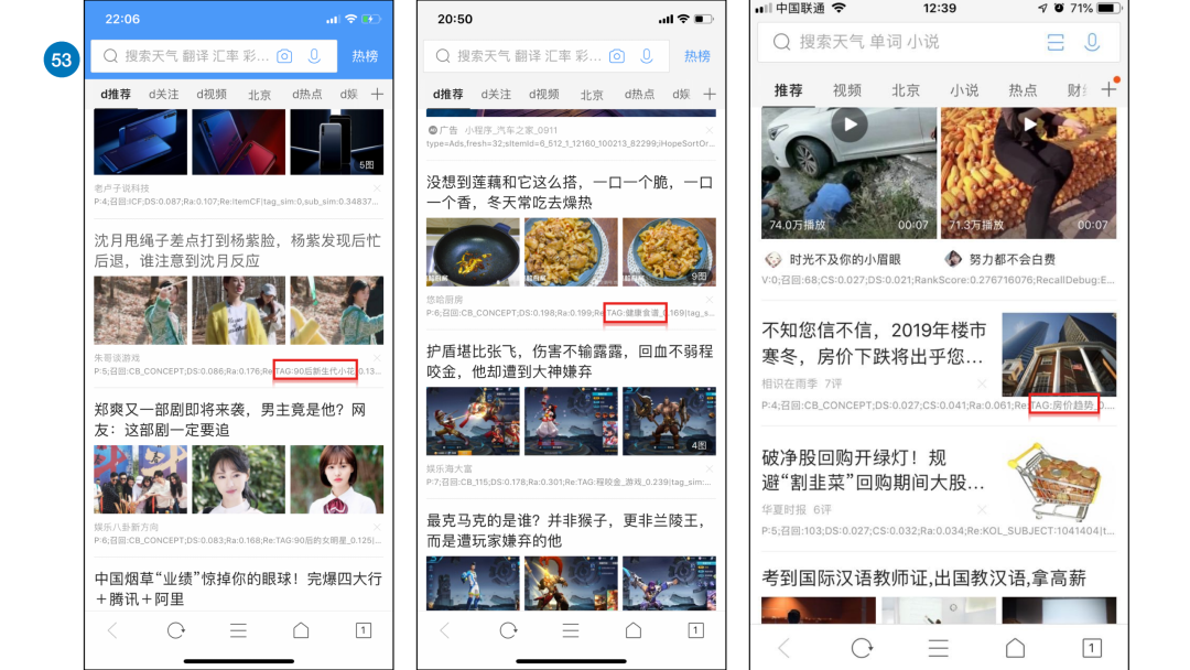 这里有更多的例子,比如上图最左侧“90后新生代小花”、中间的“健康食谱”以及右侧的“房价趋势”,可以看到这些tag并不存在于标题中,但是它们是以一种非常符合用户兴趣点的方式概括了文章的主要内容,使得其更加便于匹配用户的兴趣点,进而推荐更精准的文章。