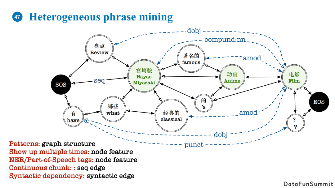 我们的做法是对于每个query或者文章标题,首先加入两个虚拟节点SOS和EOS。随后我们开始建图,图中的节点代表唯一的一个词语,这个词语可以出现在多个query和标题中。如果两个词语在一句话中位置相近,那我们在它们之间加入seq边;如果两个词在句子中位置不相近但存在语法依赖关系,那我们会在词语之间加入代表语法依赖的边。