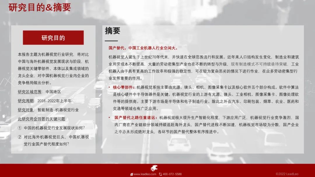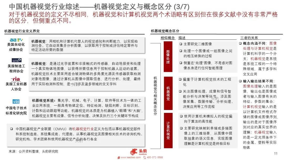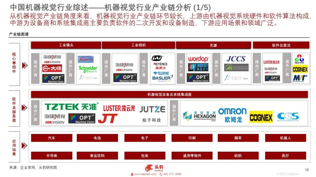 核心零部件:机器视觉系统主要由光源、镜头、相机、图像采集卡以及核心软件五个部分构成。软件中算法是核心硬件中半导体器件是关键。机器视觉行业的上游有光源、镜头、工业相机、图像采集卡、图像处理软件等的提供商。主要下游市场是半导体和电子制造行业。除此之外在汽车、印刷包装、烟草、农业、医药和交通等领域也有广泛应用。