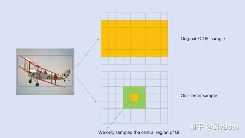 原始论文:GT bbox 内的点,分类时均作为正样本(下图上面小图的所有黄色区域)。