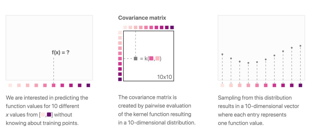 我们将测试点两两配对,在这个函数上求值以获取协方差矩阵,这个步骤在下图中也有所显示。为了对核函数的作用有一个更直观的理解,我们可以想一想协方差矩阵中元素描述的是什么。Σ_ij 描述的是第 i 个点和第 j 个点之间的相互影响,这和多元高斯分布的定义一致。在多元高斯分布的定义中,Σ_ij 定义了第 i 个随机变量和第 j 个随机变量之间的相关性。由于核函数描述的是函数值之间的相似度,它便控制了这个拟合函数可能拥有的形状。注意,当我们选择一个核函数时,我们要确保它生成的矩阵遵循协方差矩阵的属性。