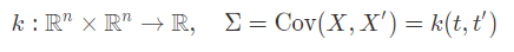 高斯过程中巧妙的一步是如何设置协方差矩阵Σ。协方差矩阵不仅仅描述了这个分布的形状,也最终决定了我们想要预测的函数所具有的特性。我们通过求核函数 k 的值来生成协方差矩阵,这个核函数通常也被称为协方差函数,作用在两两成对的所有测试点上。核函数接收到的输入是两个点,,返回的是一个标量,表达了这两个点之间的相似度。
