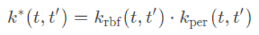 核函数的一大优势是,它们可以被结合起来,形成一个更加专精的核函数。这使得某个领域的专家可以加入更多的信息,使预测更加精确。通常我们结合不同核函数的方法是把它们相乘。我们可以考虑一下两个核函数的情况,比如说一个径向基函数核 k_rbf 和一个周期核 k_per。我们是这样把它们结合起来的: