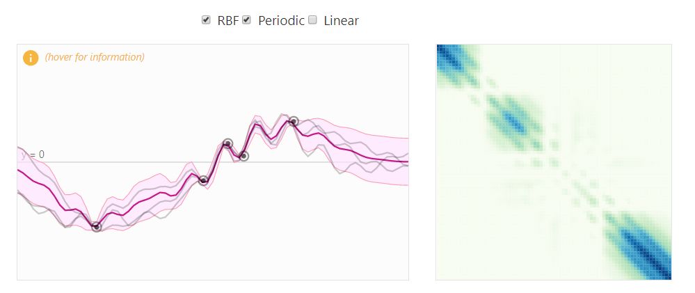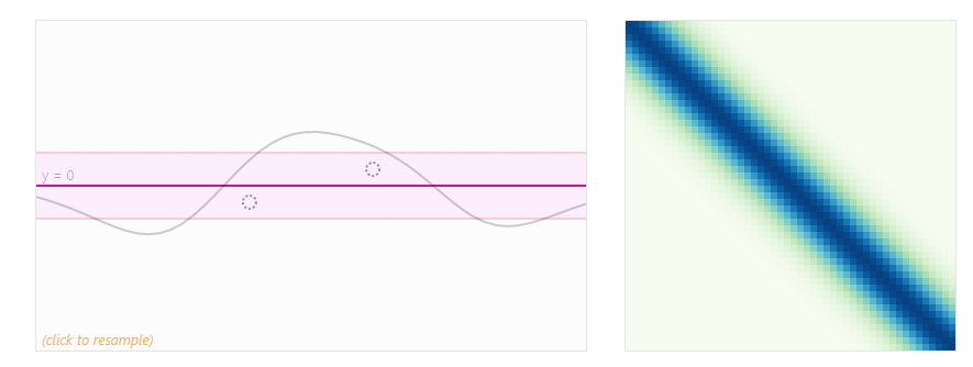 没激活任何训练数据的时候,图中显示的是一个高斯过程的先验分布,它使用的是径向基函数核。光标悬停在协方差矩阵上时,渐变色上的不透明度显示了一个函数值对它的相邻点的影响。当我们观察到训练数据的时候,这个分布会发生变化。可以通过点击单个点激活它们。然后,高斯过程被约束,倾向于给那些与这些点相交的函数更高的概率。对训练数据的最佳阐释就蕴含在更新过的均值函数里。