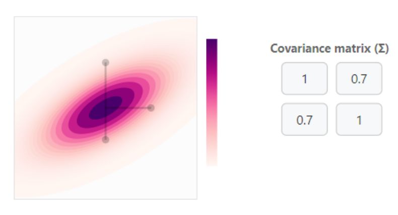 这是一个互动式的图,通过拖动图中的三个点,你可以调节每个维度上的方差,以及两个随机变量之间的关联。紫色的部分指的是分布内高概率的区域。