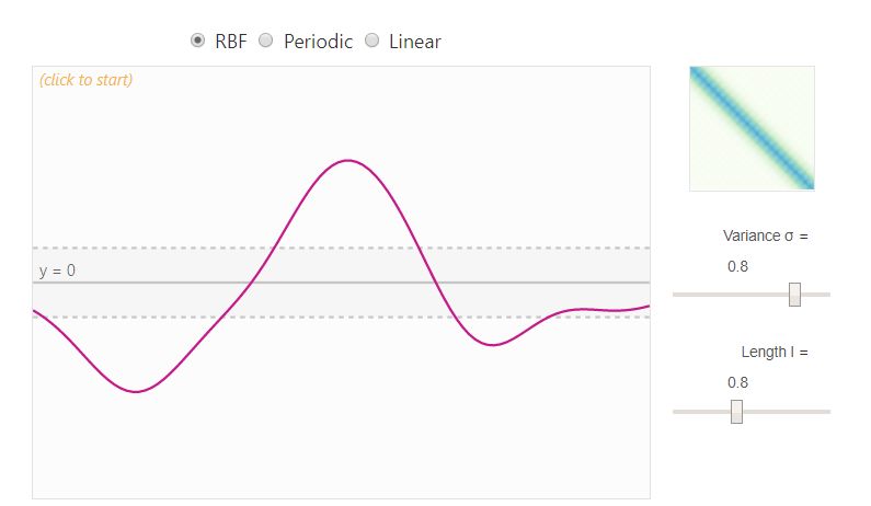 点击图片可以得到一系列在高斯过程中使用指定核函数时的连续采样。在每次采样过后,之前的样本会在背景里被淡化。一段时间后,大概可以看到这些函数围绕均值 µ呈正态分布。