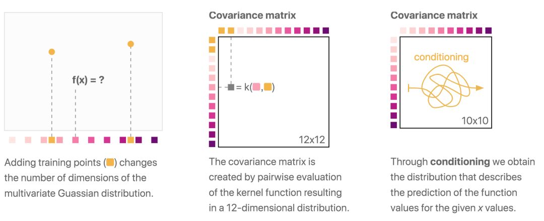 增加训练点 (■) 会改变多元高斯分布的维数;通过两两配对核函数的值生成协方差矩阵,结果是一个十二维的分布;在条件作用下,我们会得到一个分布,这个分布可以描述我们对于给定 x 值所预测的函数值。