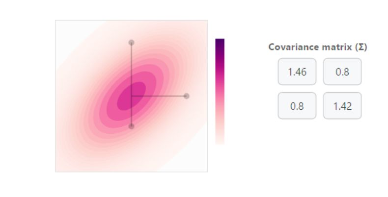 从图形上来看,该分布以均值为中心,由协方差矩阵决定其形状。下图展示了这些参数对于一个二维高斯分布的影响。每个随机变量的标准差在协方差矩阵的对角线上,而其它的值则显示了它们之间的协方差。