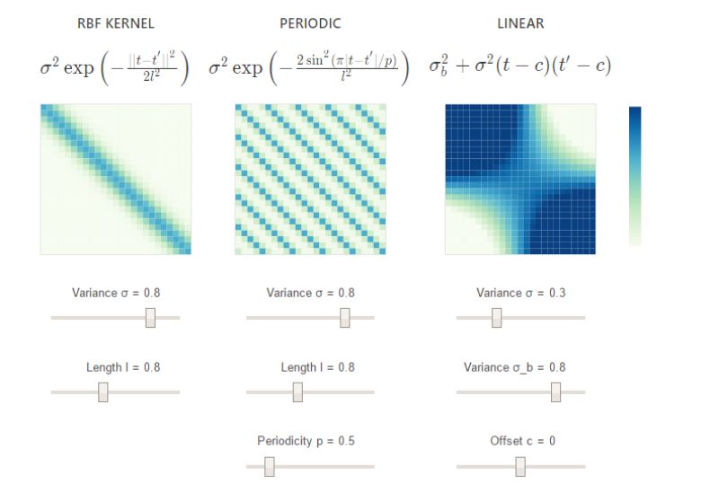 正如我们之前介绍的,高斯过程的强大在于它所选的核函数。这一点使得专家可以把某个领域的知识引入到这个过程中,使得高斯过程足够灵活,足以捕捉训练数据中的趋势。比如,一个专家可以通过为径向基函数核选取一个合适的带宽,来控制结果中的函数的平滑度。