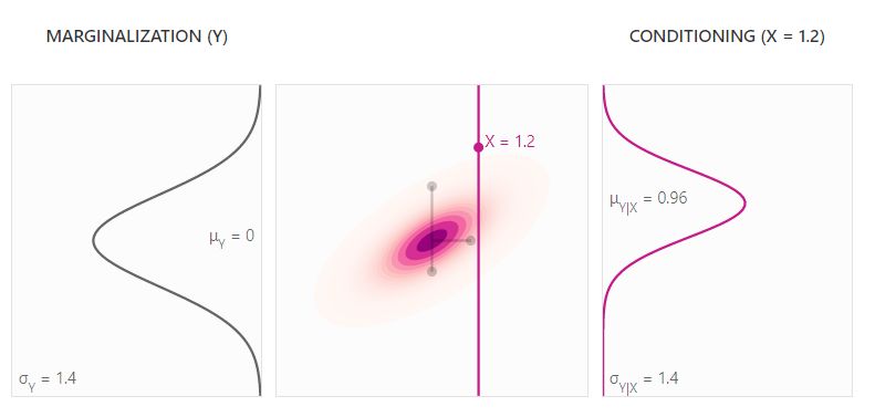 中间是一个二元正态分布。图左是该分布关于 Y 做边缘化的结果,类似于沿着 Y 轴做累加。图右是以给定的 X 为条件的分布,类似于在原始分布上切下一刀。你可以通过拖动图中的点来修改这个高斯分布和作为条件的变量。