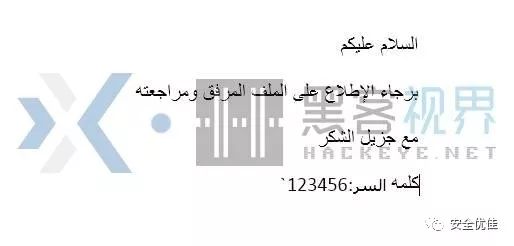 攻击者在7月15日到16日之间发送了鱼叉式网络钓鱼电子邮件。每封电子邮件都附带有一个受密码保护的RAR文件,名为“credential.rar”。如图1所示,电子邮件的正文是采用阿拉伯文编写的,并指示收件人解压缩附件以查看文档。正文内容还包括解压RAR文件所需的密码“123456”,而RAR文件则包含一个恶意的. iqy文件,名为“credential.iqy”。