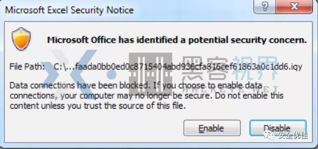 图2.使用Microsoft Excel打开.iqy文件弹出的安全通知
