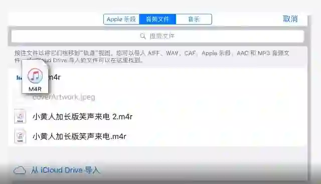 接着再点击右上角这个带两个尾巴的圆形图标,在弹出的界面里选择音频文件,然后从iCloud Drive导入。