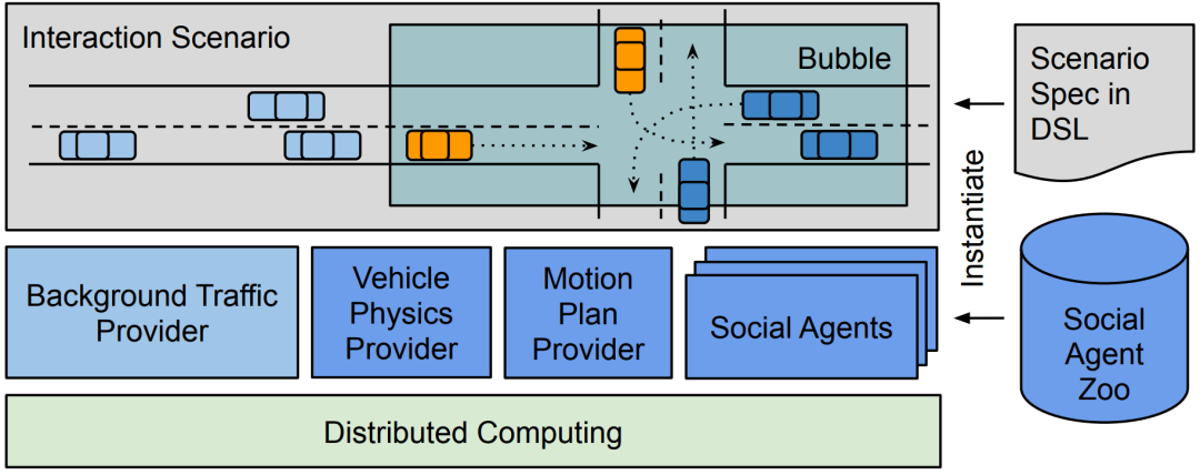 上图是SMARTS 模型架构,其交互方案是使用特定领域语言(DSL)定义的。Social智能体是从“ Social智能体Zoo”中实例化而来。橙色车辆由学智能体控制、深蓝色车辆由 Social智能体控制、浅蓝色车辆由交通服务提供商控制。