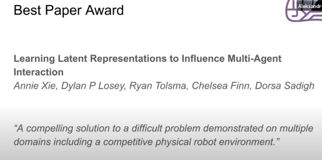 本次荣获CoRL最佳论文奖的是来自斯坦福大学和弗吉尼亚理工大学合作的《Learning Latent Representations to Influence Multi-Agent Interaction》。