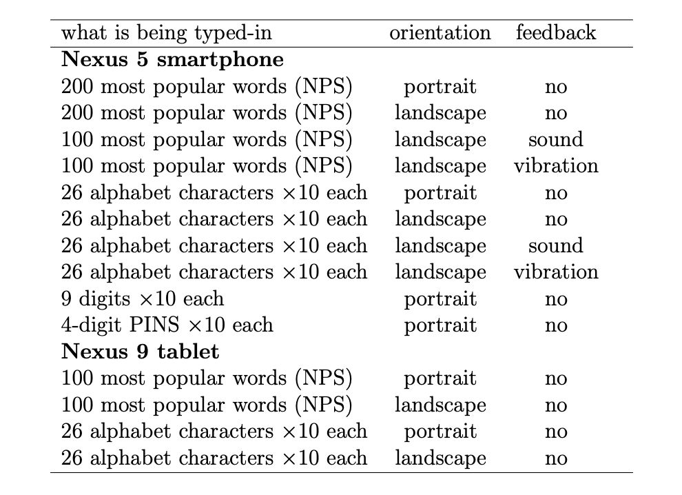 剑桥研究团队开发了一个 Android 应用程序,参与者分别使用全键盘和9宫格数字键盘输入单词、任意数字或4位数字(PIN码),横屏或者竖屏都可以。该app应用程序通过内置麦克风收集音频。