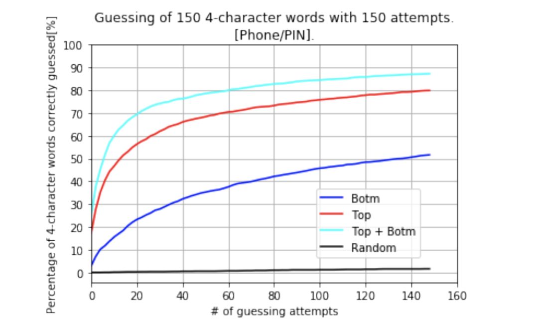 使用单个麦克风,10次尝试后可以恢复54%的PIN。通和先前工作进行了比较发现,在很多情况下往往表现的更好,在其他方面也不输给先前工作。例如,使用两个麦克风,只需20次尝试就可以恢复91/150个PIN码,并不需要知道PIN码的分布情况,也不需要知道后续点击之间的时间间隔。