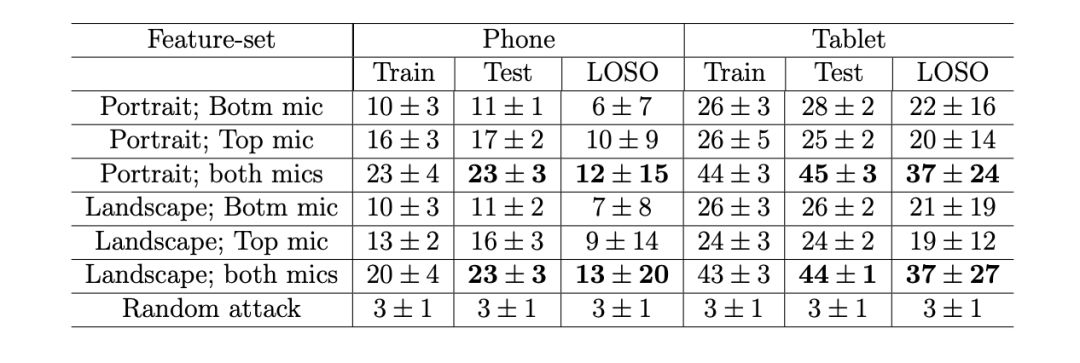 如果同时使用一个麦克风进行LOSO和测试,要比随机猜测高出三倍。顶部麦克风捕获的声音,比来底部麦克风产生更好的效果。