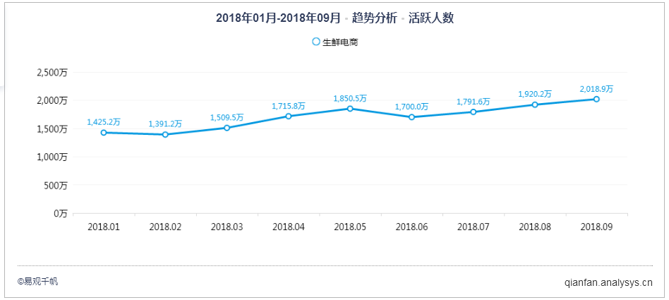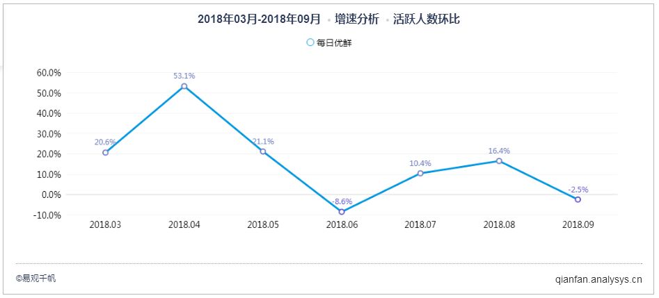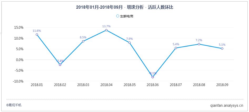 9月,秋日丰收季与大闸蟹吃蟹季来临,多款时令生鲜上市。生鲜电商持续稳定增长,月度活跃人数达到2018.9万,环比增速小幅回落至5.1%;与去年同期的月度活跃人数相比,同比增长66.1%。在月活增速逐渐放缓的背景下,生鲜电商重点发力社交模式、积极扩张门店,争抢线上线下流量;通过深耕会员体系维持用户黏性,完善生态系统。