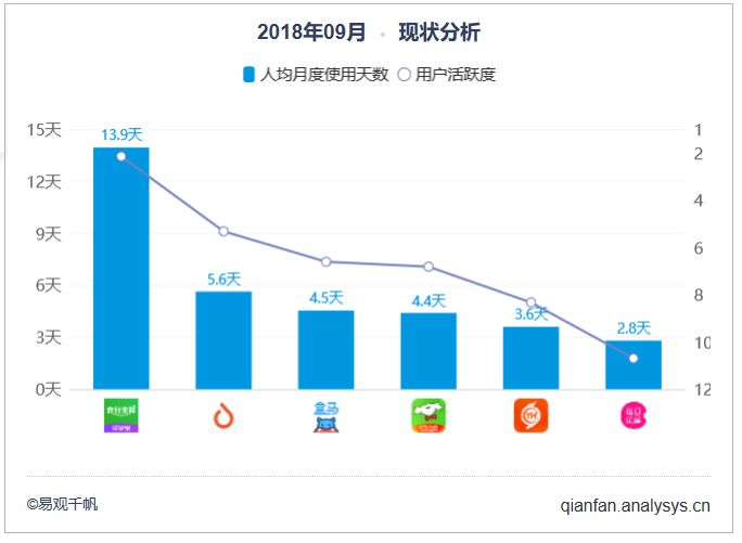9月食行生鲜通过初秋开仓季、生鲜节、会员日等一系列活动运营,活跃人数继续攀升,仅上海、苏州、无锡三座城市,日活就达到34.1万。从用户粘性方面看,食行生鲜的人均月度使用天数和用户活跃度均稳居行业第一。