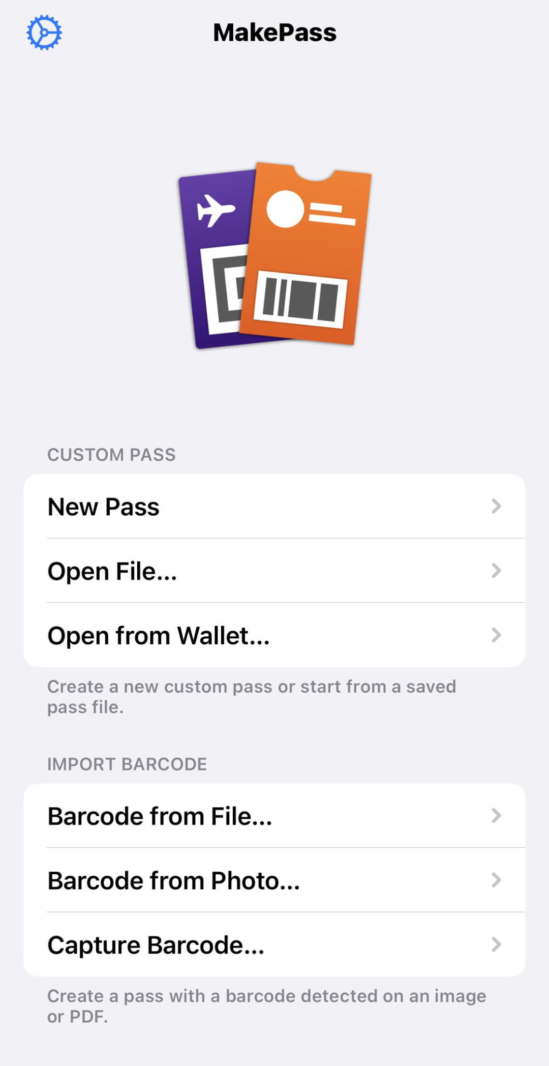 打开 iOS 的 MakePass App,映入眼帘的就是三个选项 New Pass、Open File 以及 Open From Wallet。这一点与 Pass2U 基本相似。