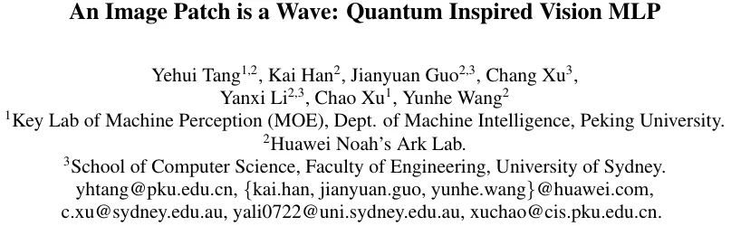 来自华为诺亚方舟实验室、北京大学、悉尼大学的研究者提出了一种受量子力学启发的视觉 MLP 新架构。