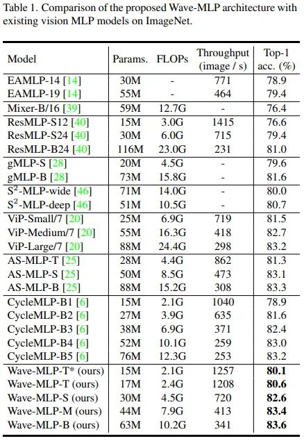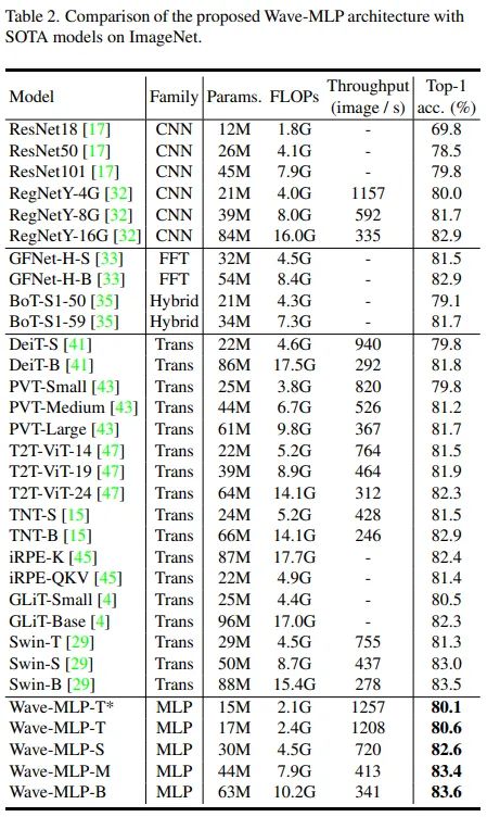 ImageNet 上图像分类的结果如表 1,表 2 所示:相比于现有的 Vision MLP 架构和 Transformer 架构,WaveMLP 都取得了明显的性能优势。