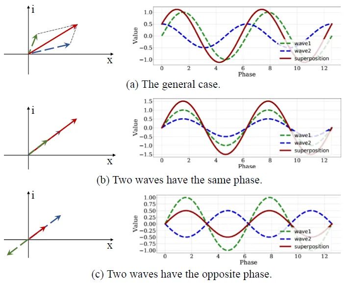 两个 Token 之间的相位差对它们的聚合过程有很大影响 (如下图 3 所示)。当两个 token 具有相同的相位时,它们会相互增强,得到幅值更大的波(图 3(b));当两个 token 相位相反时,他们合成的波将相互减弱。在其他情况下,它们之间的相互作用更加复杂,但仍取决于相位差(图 3(a))。经典方法中使用实值表示 token 的,这实际上是上式的一个特例。