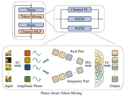 那么,对于视觉 MLP 中的图像块,能不能也把它表示成波的形式呢?该研究用幅值表达每个 Token 所包含的实际信息,用相位来表示这个 Token 当前所处的状态。在聚集不同 Token 信息的时候,不同 Token 之间的相位差会调制它们之间的聚合过程(如图 3 示)。考虑到来自不同输入图像的 Token 包含不同的语义内容,该研究使用一个简单的全连接模块来动态估计每个 Token 的相位。对于同时带有幅度和相位信息的 Token,作者提出了一个相位感知 Token 混合模块(PATM,如下图 1 所示)来聚合它们的信息。交替堆叠 PATM 模块和 MLP 模块构成了整个 Wave-MLP 架构。