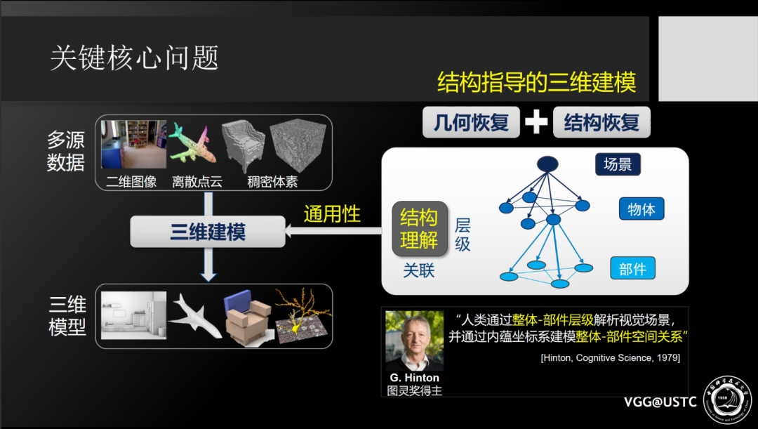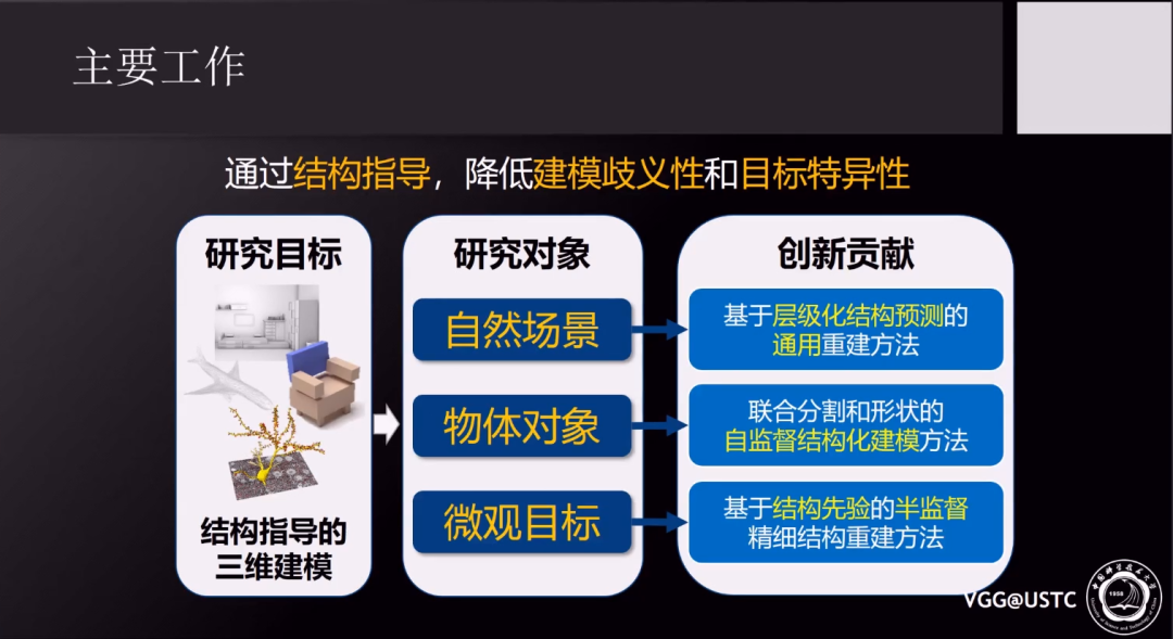 陈雪锦老师介绍了三维建模的核心问题,并进一步介绍了在深度学习的背景下,如何利用几何结构信息来指导复杂场景的三维重建以及宏观和微观目标的三维结构化建模。