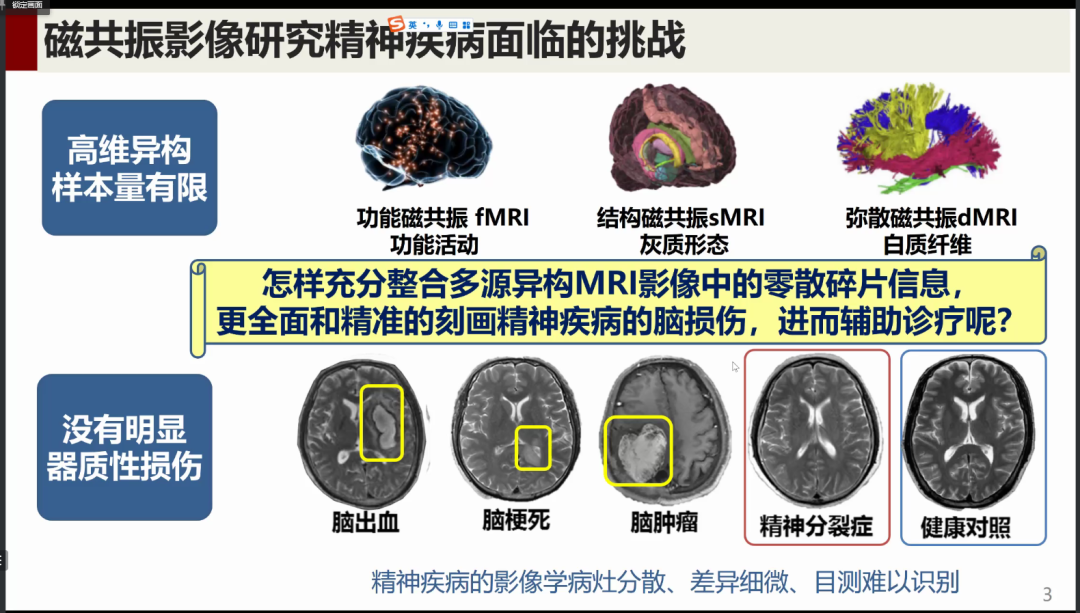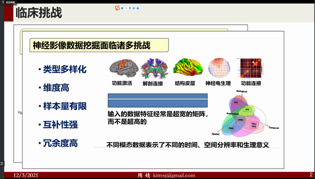 隋婧老师主要面向脑疾病与人工智能交叉前沿,介绍了基于数据驱动的多模态脑影像的生物学标记技术,以及在临床方面的应用。