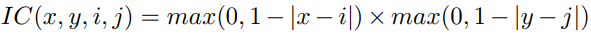 研究者引入了精准 RoI 池化(简写成:PrRoI 池化)来助力研究者的边界框修正。其没有任何坐标量化,而且在边界框坐标上有连续梯度。给定 RoI/PrRoI 池化前的特征图 F(比如,来自 ResNet-50 中的 Conv4),设 wi,j 是该特征图上一个离散位置 (i,j) 处的特征。使用双线性插值,这个离散的特征图可以被视为在任意连续坐标 (x,y) 处都是连续的: