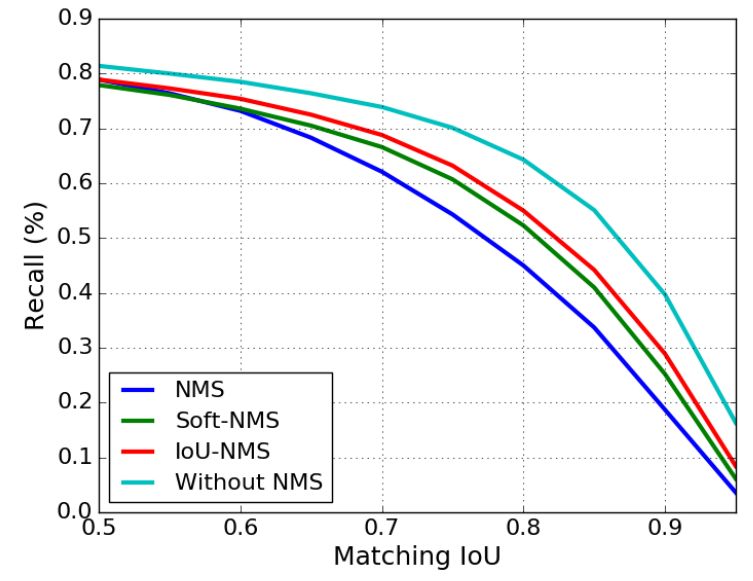 图 7:在匹配检测到的边界框与真实目标框的不同 IoU 阈值下,不同 NMS 方法的召回率曲线。研究者提供了 No-NMS(不抑制边界框)作为召回率曲线的上限。研究者提出的 IoU-NMS 有更高的召回率,并且在高 IoU 阈值(比如 0.8)下能有效收窄与上限的差距。