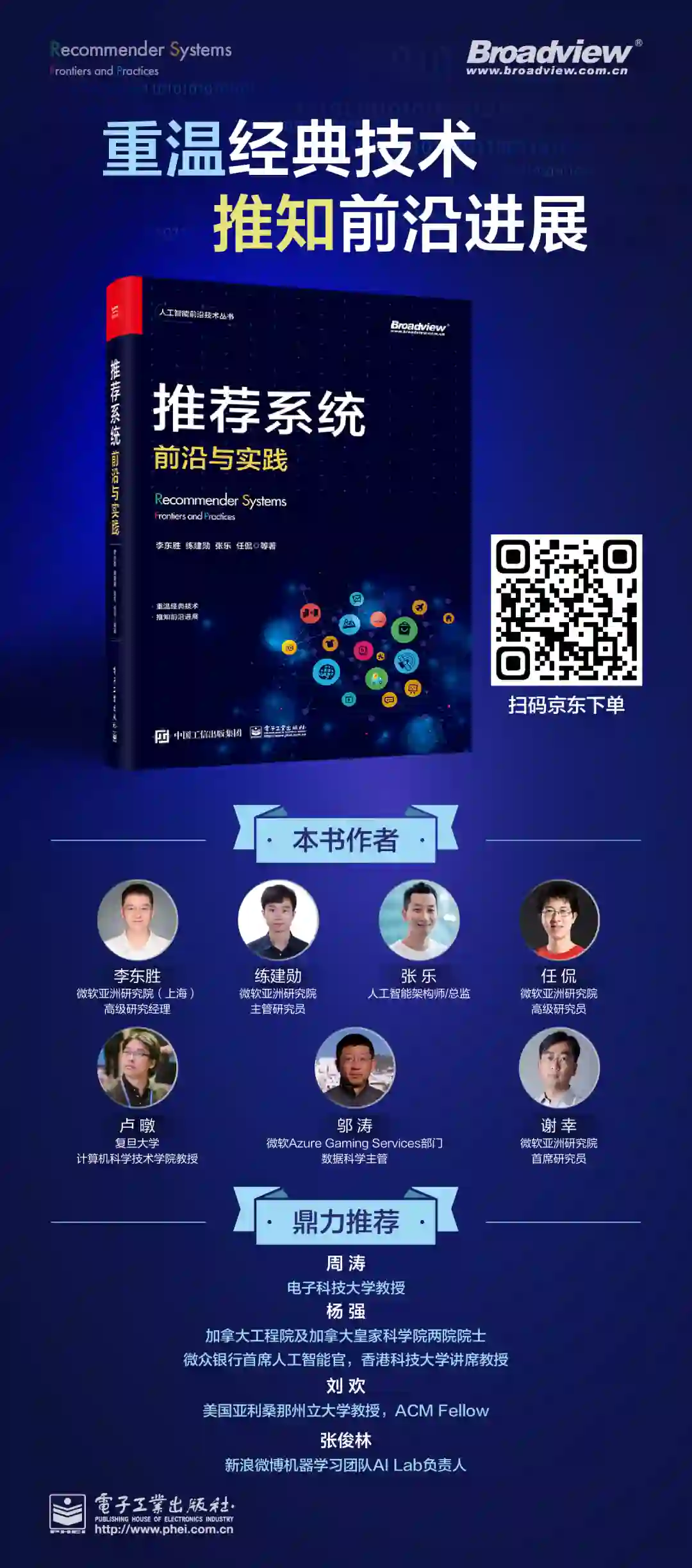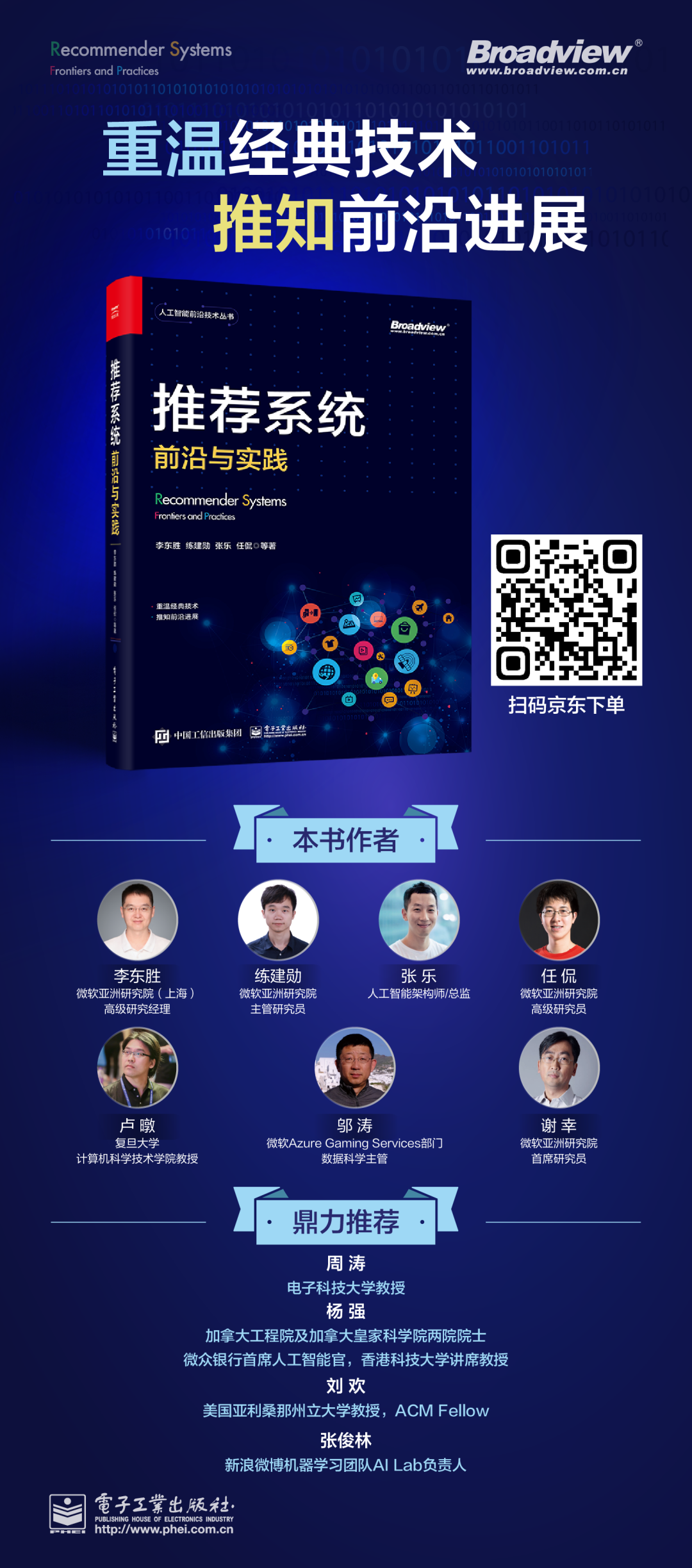 本书作者李东胜、练建勋、张乐、任侃、卢暾、邬涛、谢幸长期活跃在推荐系统研发一线,在推荐系统领域的权威会议和期刊上发表过数百篇有影响力的学术论文,主持开发包括Microsoft Recommenders在内的多个成功推荐系统项目。
