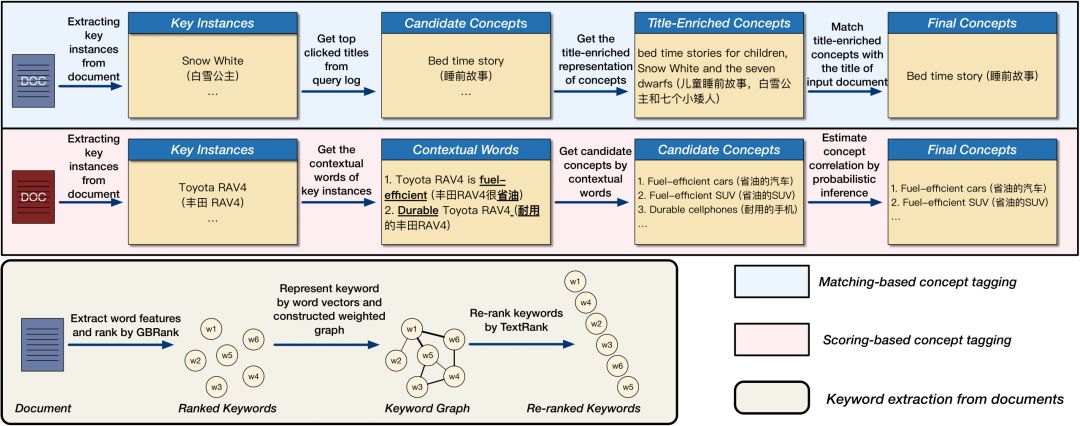 图3 展示了ConcepT系统给文章打上概念标签的原理。主要包含两种策略: