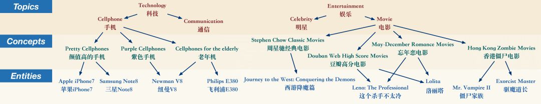 通过提取主题,概念,实体之间的 isA关系,我们构建了一个三层的分级系统,来保存它们之间的联系。