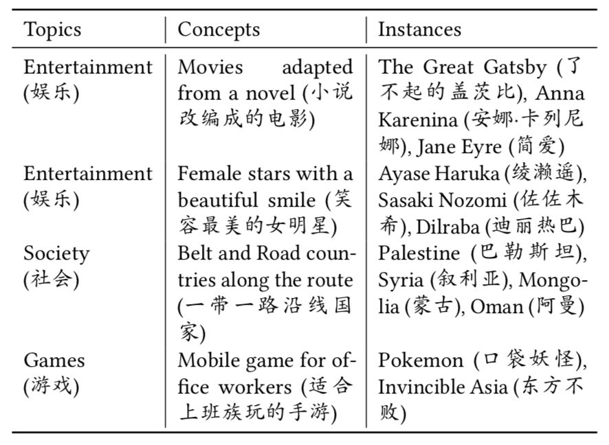 过去的研究工作,包括DBPedia, YAGO, Probase等等知识图谱或者概念库,从维基百科或者网页文章中提取各种不同的概念。但是这样提取的概念和用户的认知视角并不一致。例如,与其认识到丰田4Runner是一款丰田SUV或者说是一种汽车,我们更感兴趣是否能把它概念化为“底盘高的汽车”或者“越野型汽车”。类似地,如果一篇文章在讨论《简爱》,《呼啸山庄》,《了不起的盖斯比》等电影,如果我们能认识到它在讨论“小说改编的电影”这个概念,那么会帮助极大。然而,目前的知识图谱等工作目的是建立一个关于这个世界的结构化知识表示,概念提取自语法严谨的文章。因此,它们不能从用户的视角去对文本(例如query和document)进行概念化,从而理解用户的意图。另一方面,目前的工作也主要在于提取长期稳定的概念,难以提取短时间出现的热门概念(例如“贺岁大片”,“2019七月新番”)以及它们之间的联系。