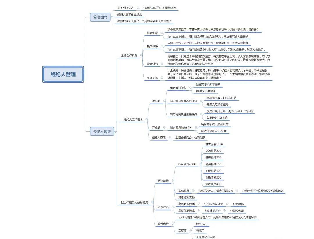 某MCN公司的经纪人管理图谱,经纪人底薪只有1450,主要靠提成