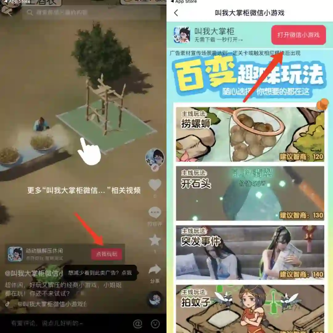现在,用户在刷抖音的过程中,时常会被推荐微信小游戏的广告。点击广告上的“点我玩玩”按钮,可获得微信小游戏的广告介绍页面,再点击一次醒目红色标识,即可直接从抖音跳转到微信小游戏。抖音中可以直接搜索并跳转的这类微信小游戏包括《叫我大掌柜》《英雄盟约》《山海经异变》《爱琳诗篇》《异兽擎天》《别惹三国》《雄霸乱世》等。