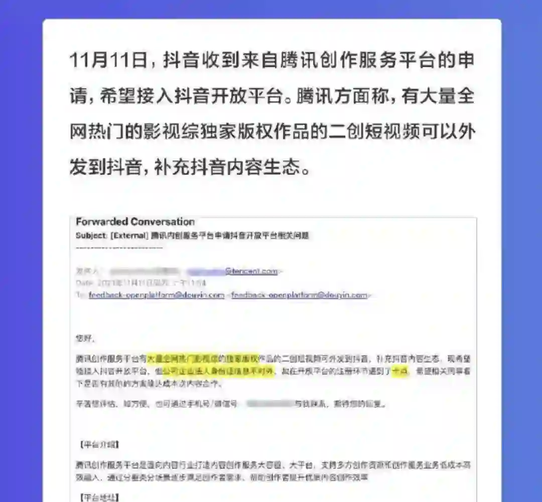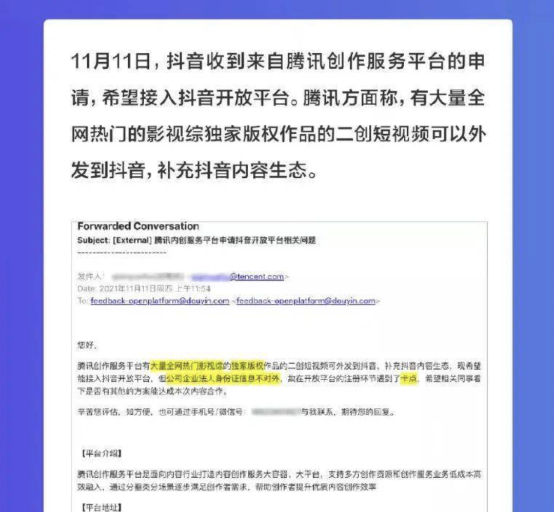 2021 年 11 月,抖音官方称收到来自腾讯创作者服务平台的申请,希望接入抖音开放平台。据抖音展示的邮件截图,腾讯方面称,“有大量全网热门的影视综艺独家版权作品的二创短视频,可以外发到抖音,补充抖音内容生态。”