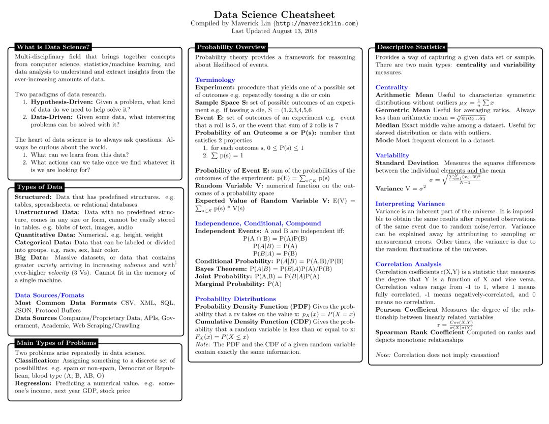 工欲善其事必先利其器!之前我也断断续续给大家发文整理过一些关于数据科学,尤其是机器学习、深度学方面的速查手册!但是,每次分享的都比较是针对某一块的内容,相对来说,还是不够全面。而且,零散的资料也不便于快速收藏和整理!