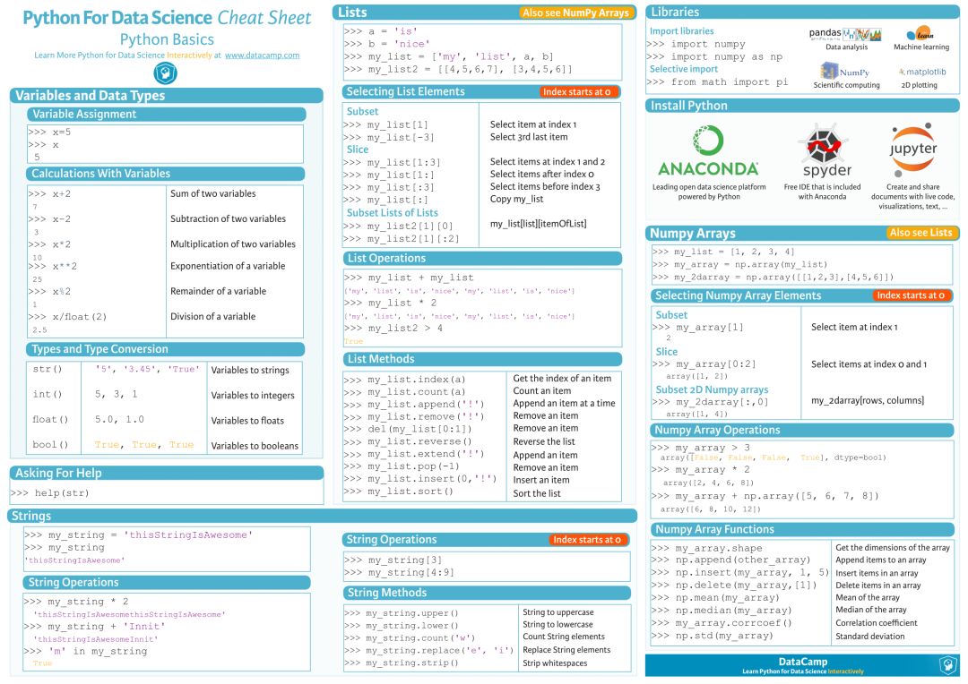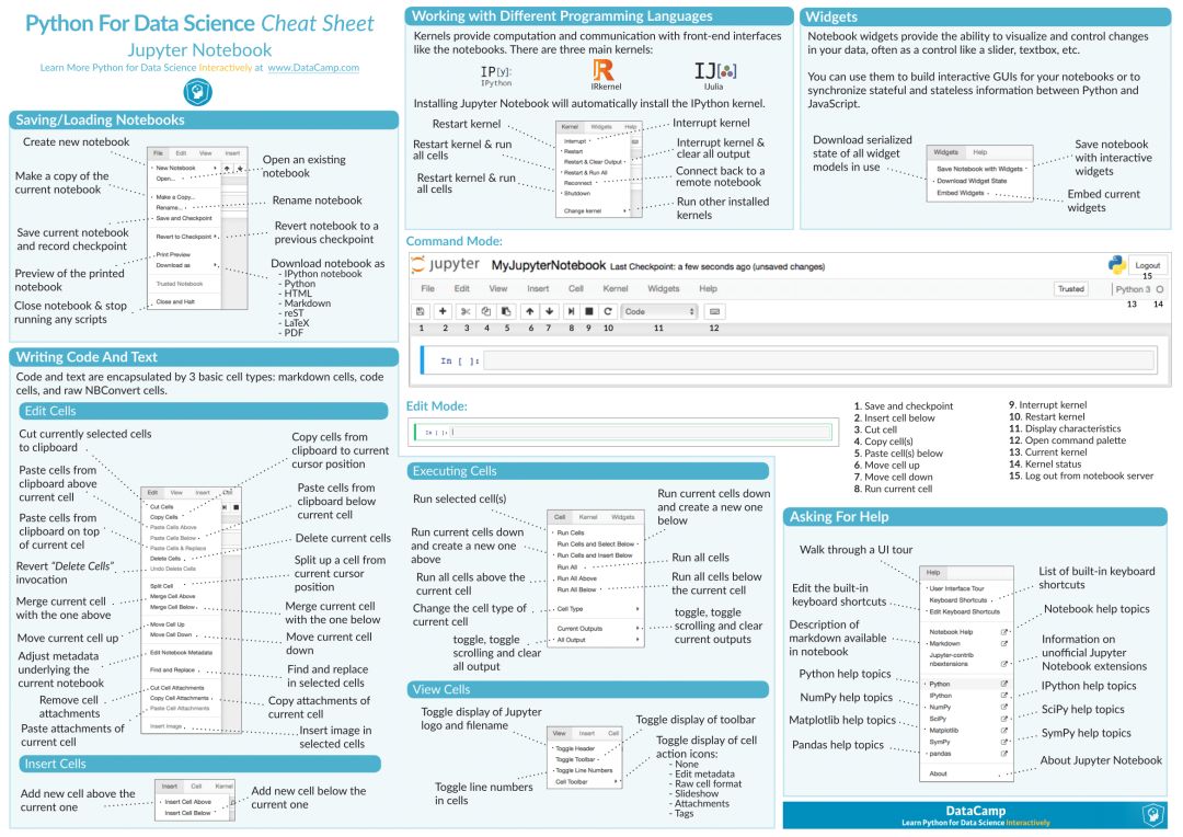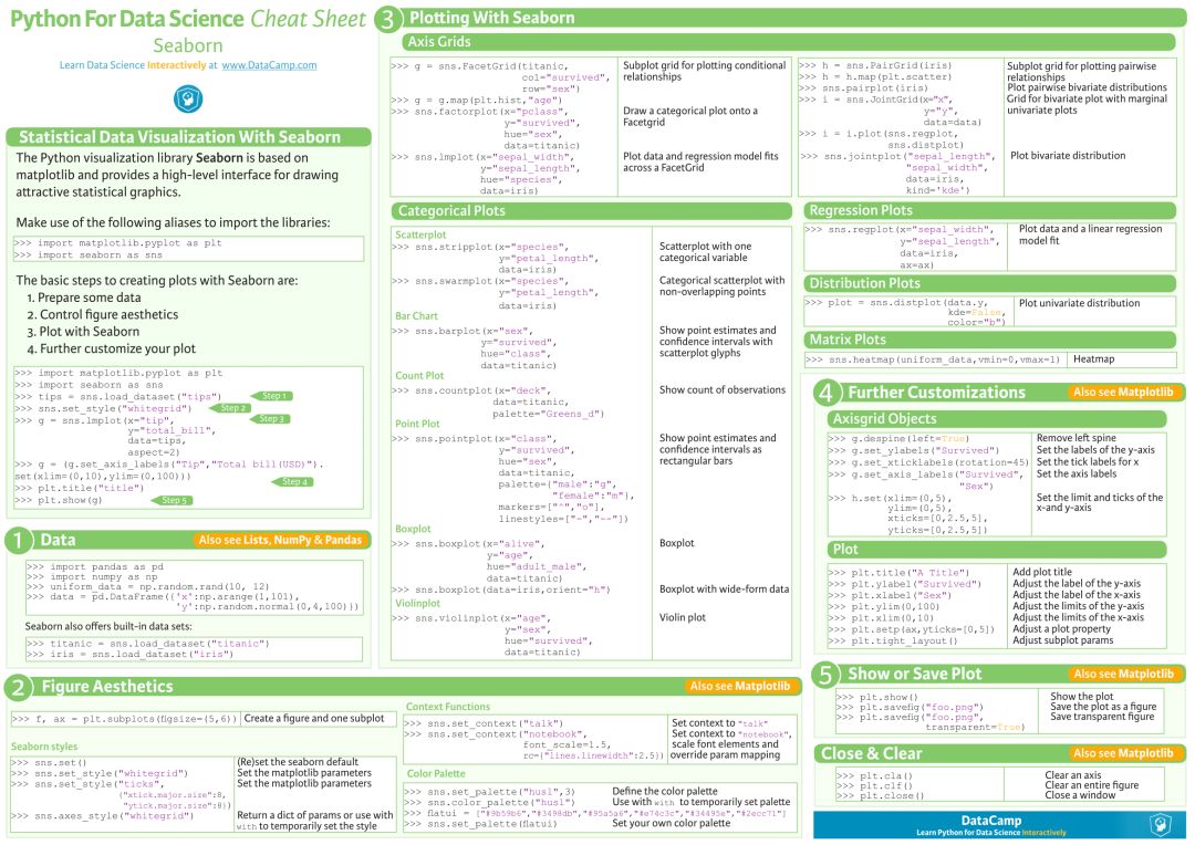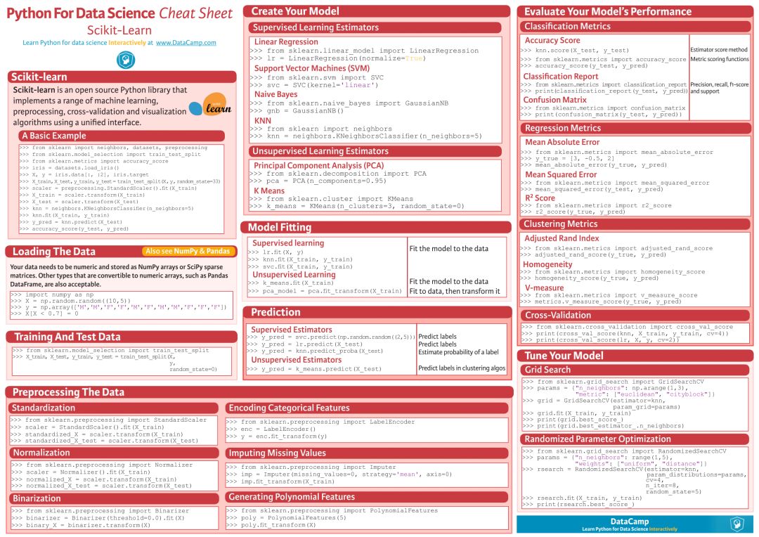 该数据科学速查手册总共包含了 10 大块内容,分别是: