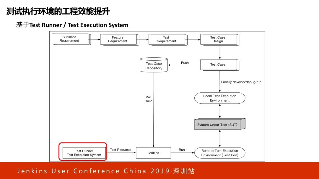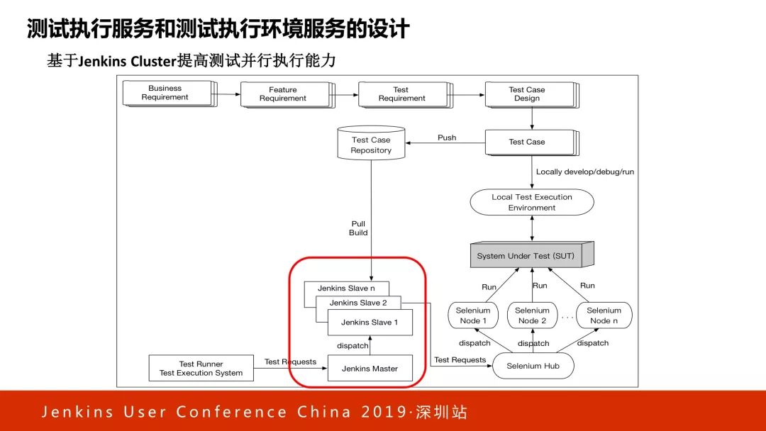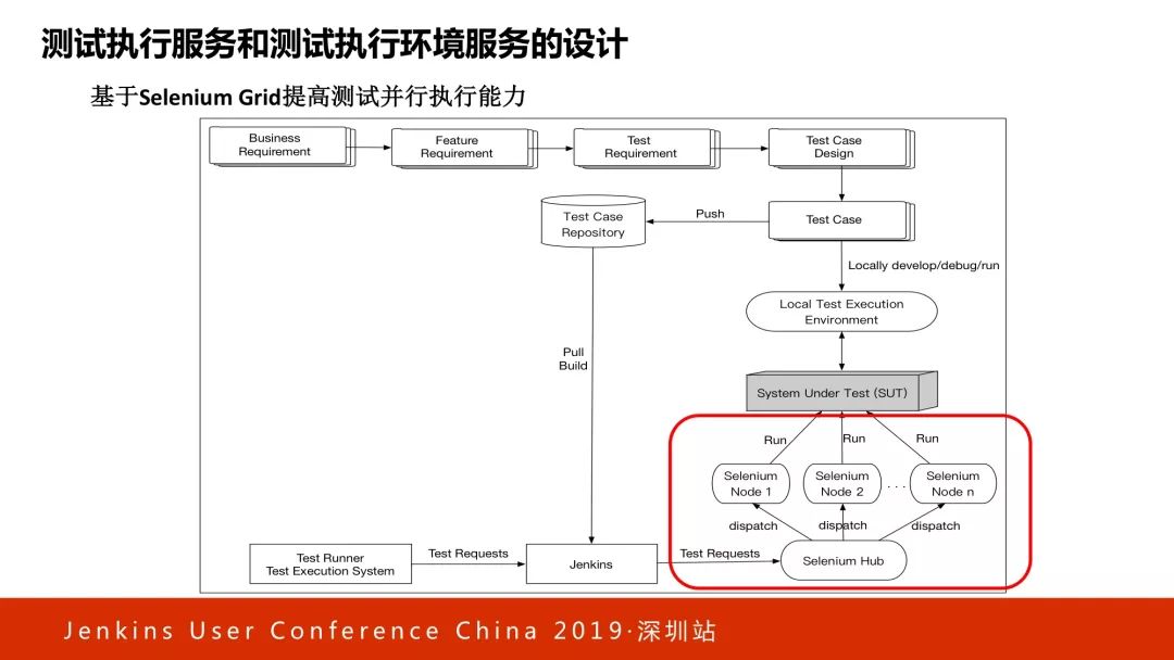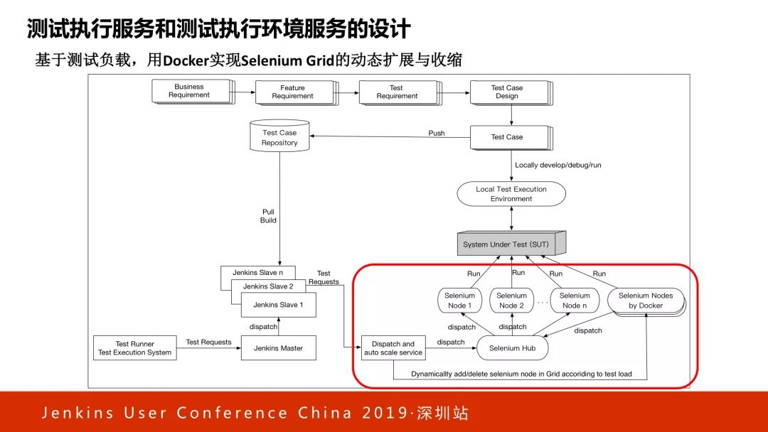 第二部分,测试执行服务和测试执行环境服务的设计。涉及 Jenkins 和容器,帮助我们非常短的时间内完成成千上万测试用例的执行。